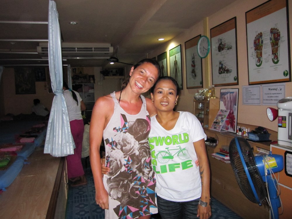 Avete trovato l’intrusa? Eccomi: sono io con la piccola Nam (piccola non solo d’età ma anche di statura e non sono una di quelle persone che può dirlo spesso). Nam che ho visto per sei giorni consecutivi mentre ero a Phi Phi Isalnd e andavo ogni giorno a farmi fare il tradizionale massaggio Thai nel centro massaggi dove lavorava. Nam che si era trasferita da tre anni dall’entroterra Thailandese a Phi Phi, lontana dalla sua famiglia e da suo figlio, per guadagnare il denaro per sostenerli economicamente lavorando più di 16 ore la giorno. Nam che il secondo giorno già mi stava raccontando la sua storia: la tristezza di dover stare lontana dai suoi cari, la speranza per un futuro migliore per la sua famiglia, la voglia di tornare a casa e l’amara consapevolezza di non poterlo fare nell’immediato. Nam che non poteva nemmeno permettersi il biglietto aereo per tornare nella sua terra. Nam che che con la sua dolcezza e tenerezza mi ha fatto piangere il giorno della mia partenza (sono una di quelle persone che, purtroppo o per fortuna, si affeziona facilmente e che non riesce a dire addio).